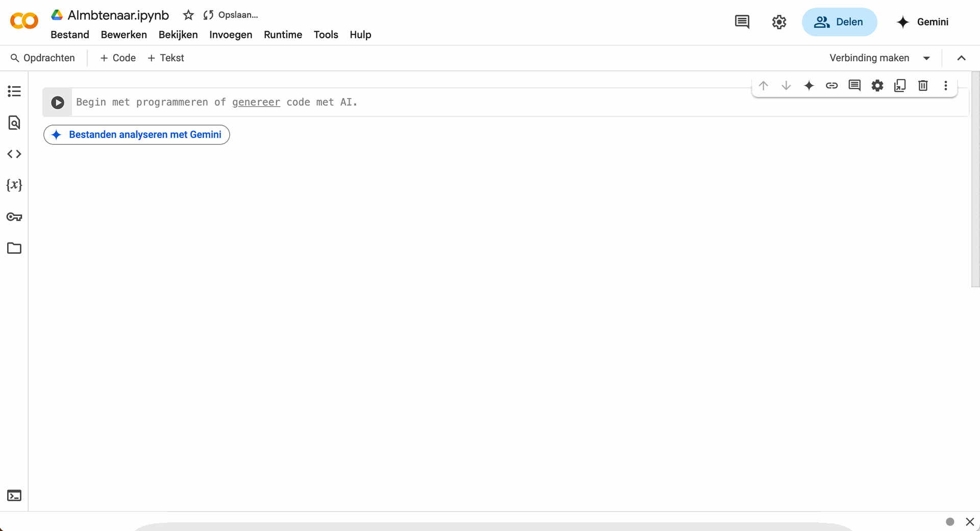 Surf naarĀ Google Colab, maak een account en open een ānieuw notebookā. Google Colab is een tool waarmee je Python code kunt schrijven en uitvoeren zonder dat je iets moeten installeren.