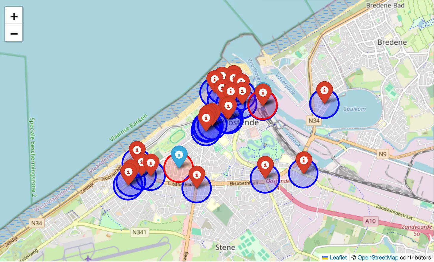 De code is nu gegenereerd. Druk op het āplayā symbool om de code uit te voeren. Er verschijnt een kaartje met de bankautomaten (blauwe cirkels) en krantenwinkels (rode cirkels).