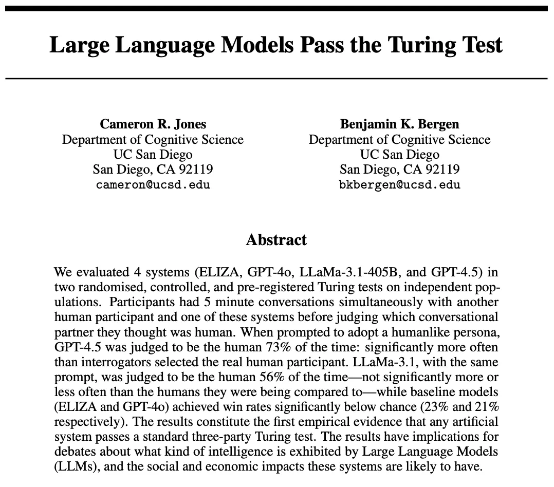Fast forward naar 2025,Ā een nieuwe studieĀ meldt dat GPT-4.5, een geavanceerd large language model (LLM), erin slaagde om in 73% van de gesprekken de testpersonen te overtuigen van zijn āmenselijkheidā.
